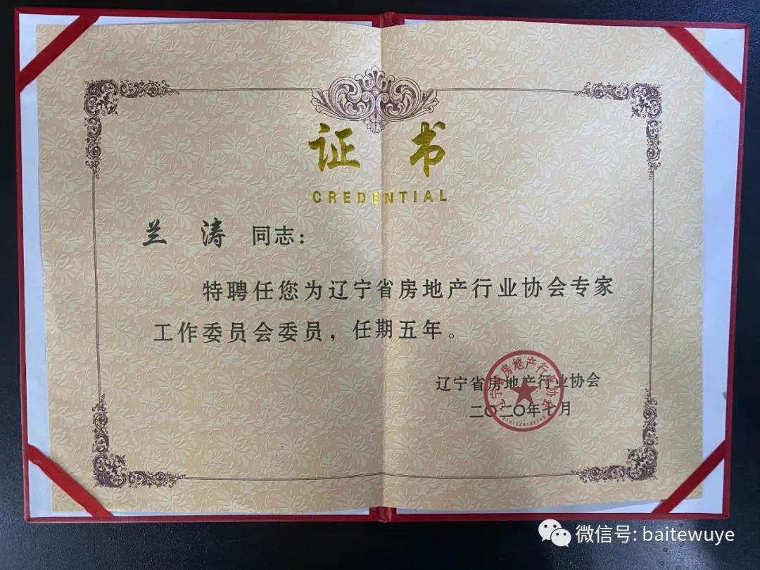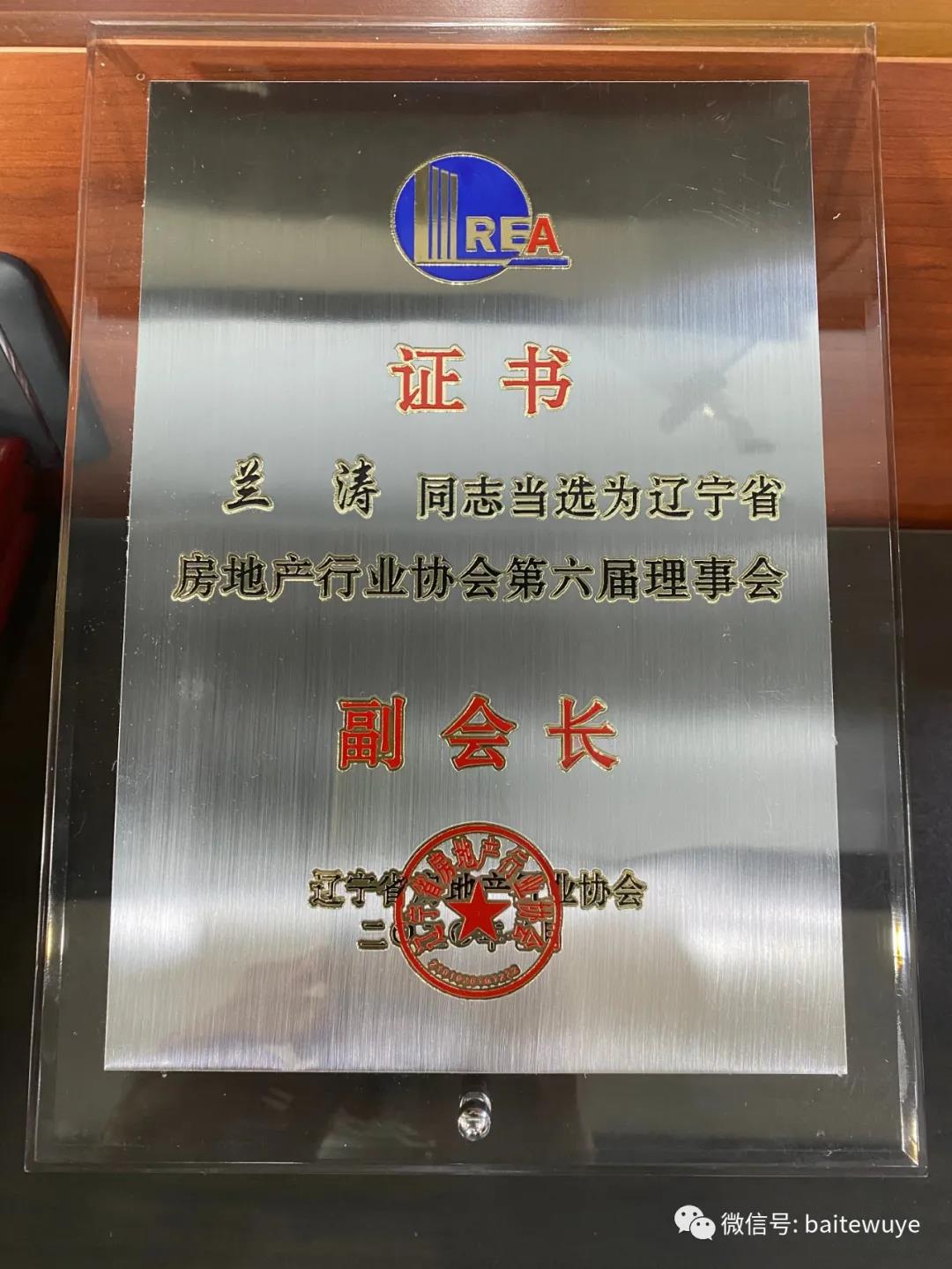 与此同时,董事长兰涛先生也担任着沈阳市中小企业协会副会长、沈阳家庭服务协会副会长、辽宁经济文化促进会理事、沈阳市于洪区应急救援服务协会会长等职务,获得了沈阳市十大杰出青年、沈阳市十大优秀创业导师、沈阳五四奖章、优秀物业经理人等多项个人荣誉。