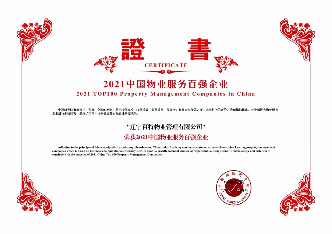 百特物业是中国物业管理协会常务理事单位,中国物业行业百强企业,辽宁省著名商标,重合同守信用企业,辽宁省物业服务企业管房面积20强企业。成立至今,百特物业已经建立了一整套有自己特色的管理制度和服务标准体系,通过了ISO9001:2015质量管理体系认证、ISO14001:2015环境管理体系认证、OHSMS18001:2007职业健康安全管理等体系。坚持以严谨的工作作风,实行规范化管理和标准化服务,努力为每一位客户提供超值的服务。
