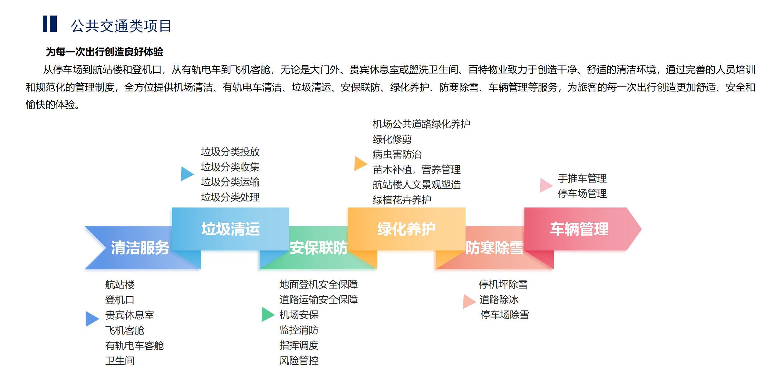 提供机场清洁、有轨电车清洁、垃圾清运、安保联防、绿化养护、防寒除雪、车辆管理等服务,为旅客的每一次出行创造更加舒适、安全和愉快的体验。